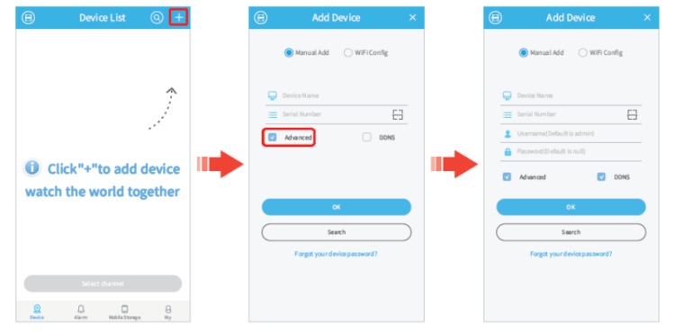 Log in to XMEye with your user name and password, then tap ‘+’ on the upper right corner. Enter the information required on the interface of Add Device, then tap OK to add the device.